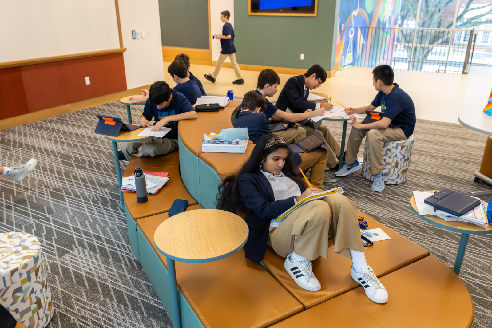 The new Rockwell Middle School building is a quintessential expression of Shady Side Academy. Contemporary Georgian in style, it maintains the traditional red brick and limestone that is characteristic of the Senior School campus, while featuring its own unique look that includes the open spaces, natural light, and sightlines of a modern school building.